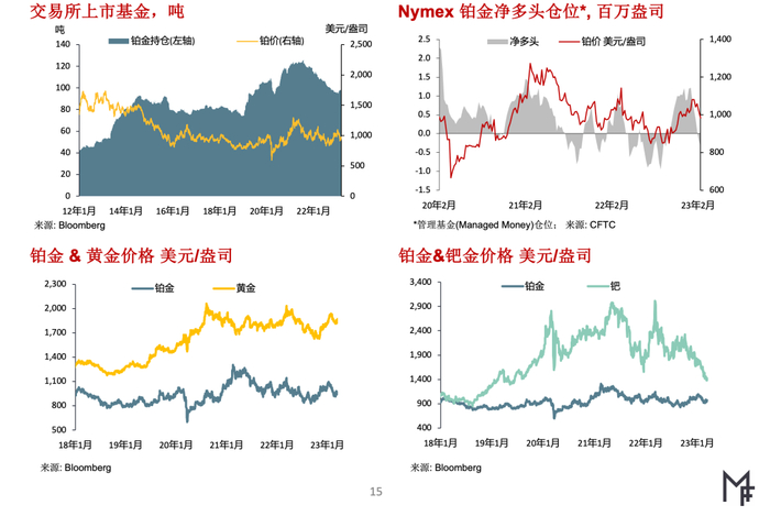 因废汽车催化剂供应量大幅下降,2022年铂金回收供应量同比下降17%。我们预计2023年再生铂金总供应量将回升10%,但因供应链问题持续存在和报废汽车供应量受限,从废汽车催化剂中回收再生的铂金数量则将增长乏力。此外,因来自黄金首饰的竞争加剧,中国铂金首饰销量持续承压,这也导致旧铂金首饰回收承压。