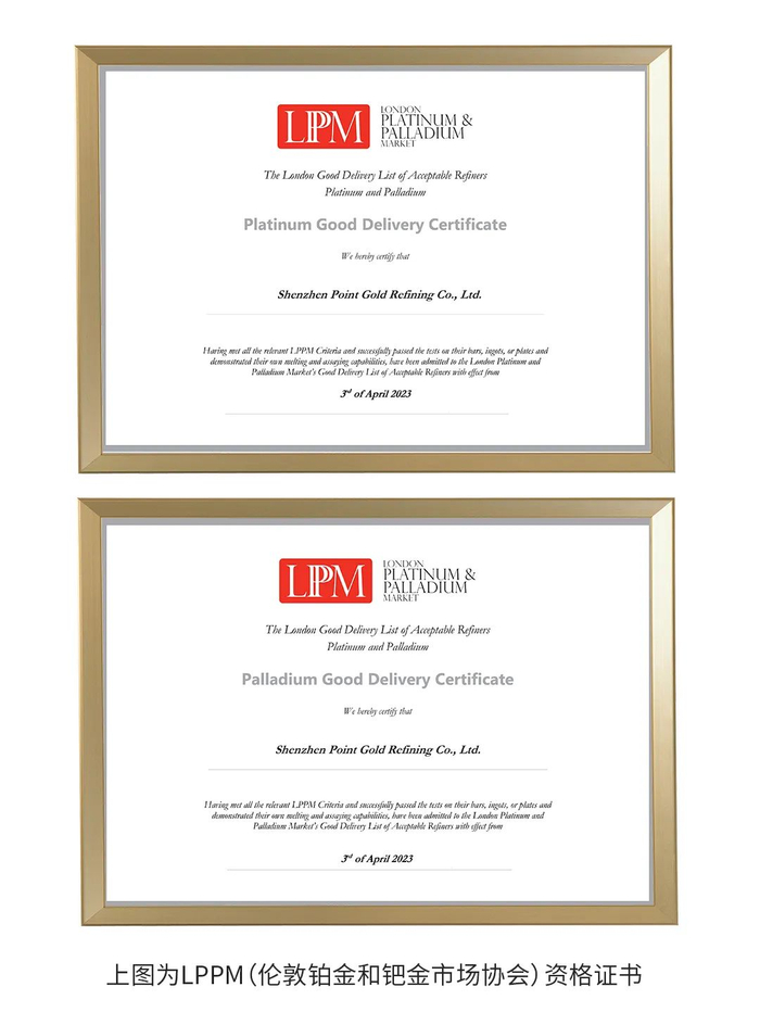近日,深圳市点金贵金属精炼有限公司通过了LPPM (伦敦铂金和钯金市场协会)的铂金和钯金合格交割精炼商资格认证,成为了国内首家获得此项资质认证的企业。标志着点金贵金属在铂金和钯金的贵金属领域,不仅具备了国际认可的管理水平和技术能力,也预示着我国铂金与钯金类的贵金属产品正式走向世界。
