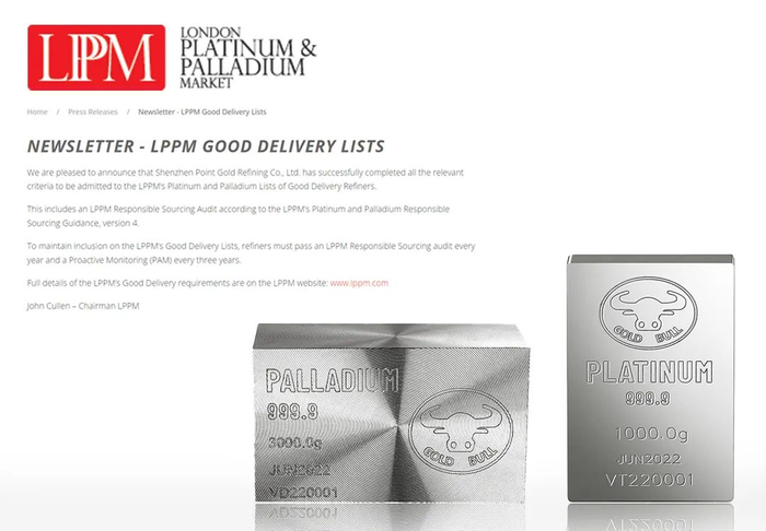 LPPM(伦敦铂金和钯金市场协会)是目前全球铂金和钯金最具权威性的、为境内外投资者提供共同参与的铂金和钯金交易平台。对于其会员的业务实力以及行业地位均有很高的要求,选拔标准更加严苛,同时也更受市场及客户认可。此次点金贵金属获批后,其出品的铂金和钯金产品,在伦敦市场不仅可以交割,更成为全球免检产品。