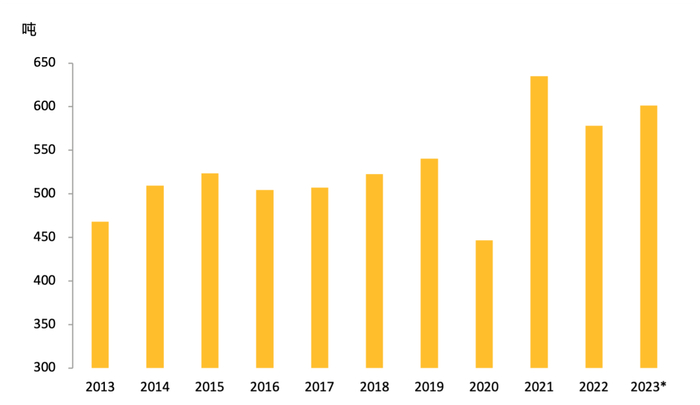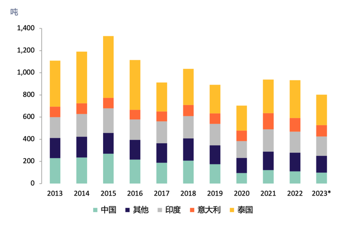 相对于银饰消费量,意大利银饰加工产量数据较为重要。2022年该国银饰加工产量为677吨,仅次于印度和泰国,位居全球第三。6月份我们赴意大利进行了实地调研,发现大多数业内人士都认为今年上半年该国银饰加工产量同比小幅上升。这与意大利国内银饰销量上升的趋势一致,但与1至5月期间意大利银饰出口量(以总重量计)同比下降2%的统计数据相矛盾。不过如果我们把去年出口量数据中明显的异常因素去除,根据银价变动进行调整并把转口排除在外,以纯银重量计今年1至5月期间意大利银饰出口量实际同比上升4%。