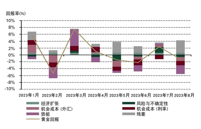 *数据截至2023年8月31日。我们的短期金价表现归因模型(GRAM)是有关金价月度回报的多元回归模型,其中包括四类关键的金价表现驱动因素:经济扩张、风险与不确定性、机会成本和势能,这些驱动因素的相关主题反映了黄金需求背后的动机,更为重要的是投资需求背后的动机。这些被认为是短期内黄金价格回报的边际驱动因素。“残差”包含了目前模型尚未捕捉到的其他因素。此处结果是基于2007年2月至2023年8月的分析。