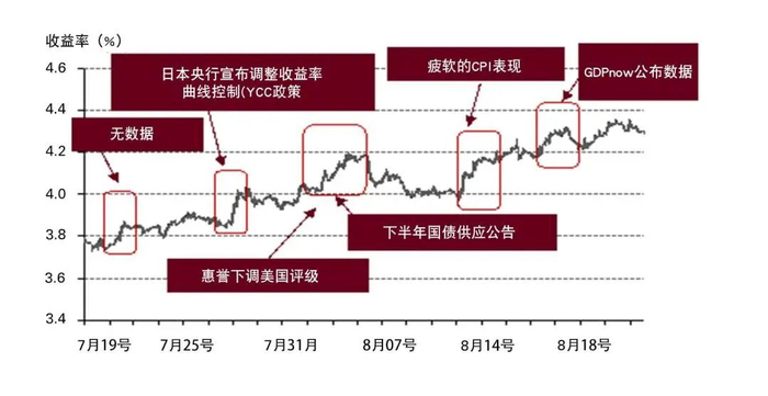 图3显示了自7月初以来美国10年期国债收益率的日内走势,以及此期间出现收益率大幅上升的七个日期。而其中只有一日的经济增长/通胀数据较为明显,即亚特兰大联储GDPnow公布2023年三季度的GDP增长率预计为5.8%。然而,随后收益率则迅速回落。