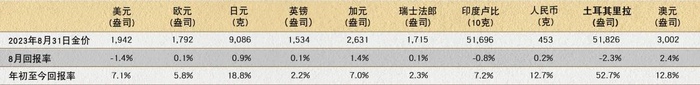 *截至2023年8月31日。计算基于以如上货币计价的LBMA午盘金价。