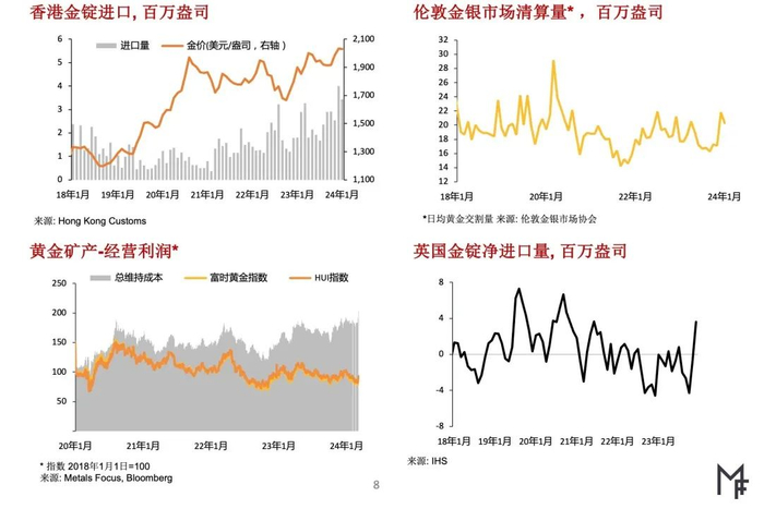 ▶展望未来,为反映金价在市场利率预期转变下仍极具韧性这一事实,我们上调了金价预测值。短期来看金价涨幅较大,因此易于受投资者获利了结的影响。不过鉴于目前市场的利率预期与美联储的指引已大体一致,金价下行空间应有限,在地缘政治形势仍动荡不安的大环境下更是如此。