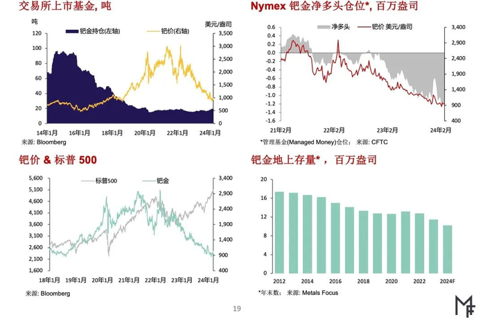 为更好反映本年迄今钯价表现疲软的情况,我们已将2024年一季度的钯价预测值下调(具体价格预测请与我们联系订阅)。预计2024年供应短缺量将达120万盎司,铂价走强,空头仓处于高位等因素将支撑2024年剩下时段内钯价较当前价位小幅上涨。