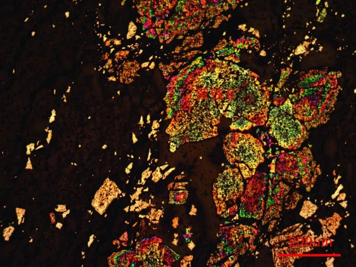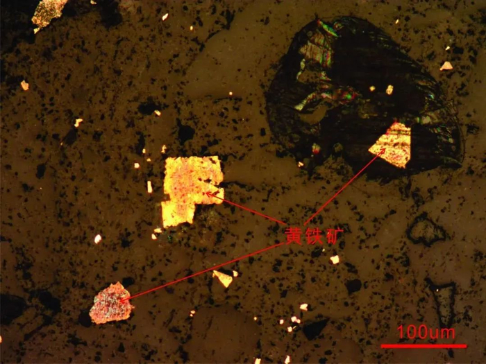 定格在岩石中的彩虹——反射光下呈团块状聚集的黄铁矿