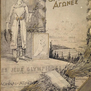 1896年第一届奥运会海报——“奥运会徽”(雅典娜女神),是雅典奥委会向国际奥委会提交报告时的封面,它是孤品,珍藏于国际奥林匹克博物馆里。图中代表雅典娜女神的年轻女子手持橄榄枝和一个树枝制成的皇冠站在雅典卫城和泛雅典体育场前