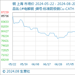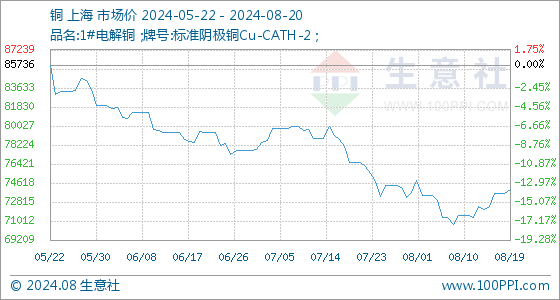 8月20日,生意社铜基准价为74035.00元/吨,与本月初(73756.67元/吨)相比,上涨了0.38%。