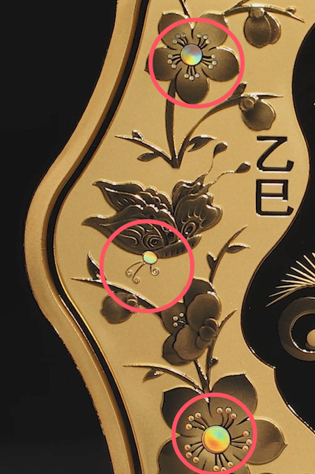这枚双蛇币看似图案元素繁复,实则繁而不乱,不同工艺的处理方式将币面一分为二,其中大部分元素都成对称布局,井然有序。这里还有点睛之笔,那就是“喷砂蛇”身上桃花和蝴蝶是多层次喷砂,且花心和蝴蝶的眼睛用了光变鳞彩工艺,画面更显勃勃生机,灵动饱满,也与“镜面蛇”形成了对比和呼应。