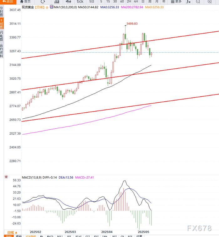 从技术面来看,金价在3,230美元附近获得初步支撑,该水平靠近4月上涨趋势线。若守稳该区间,仍有望反弹测试3,300美元上方阻力。MACD指标显示空头动能有所缓解,RSI指标自超卖区反弹,技术性反抽预期升温。