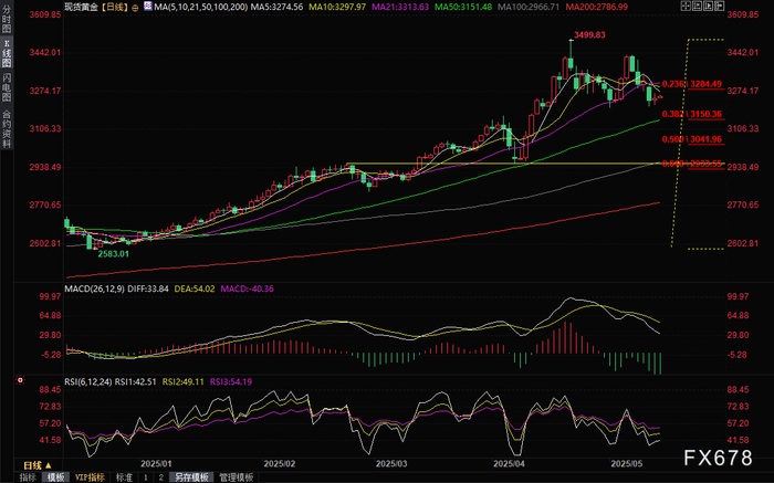 在经历了周一的暴跌后,金价周二(5月13日)小幅反弹,现货黄金周二收报3249.86美元/盎司,涨幅达0.47%。逢低买盘的涌入给金价提供支撑,而且美国4月CPI属于弱于市场预期,美联储降息预期降温,美元指数从一个月高位回落,地缘局势担忧等因素都给金价提供上涨动能。周三(5月14日)亚市早盘,现货黄金窄幅震荡,目前交投于3255美元/盎司附近。