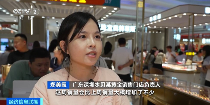 广东深圳水贝某黄金销售门店负责人 郑美霞:这周的销量比上周增加了15%左右,手镯销售情况较好,占比达50%左右。