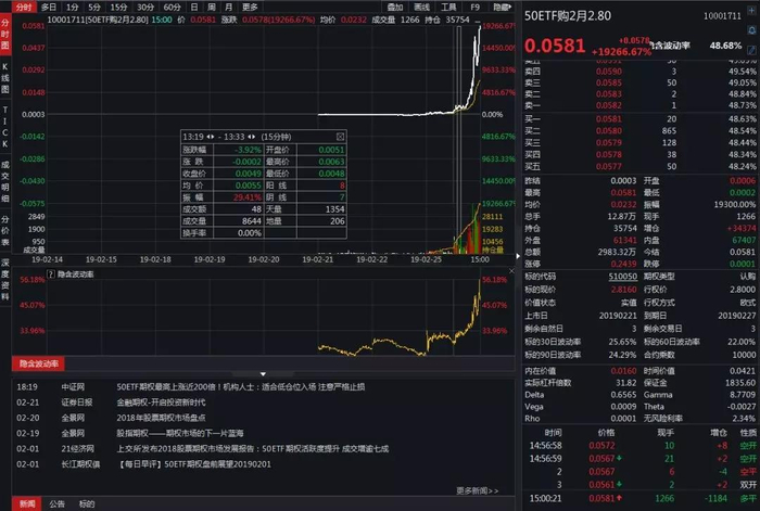 从日内价格变化情况看,50ETF购2月2800合约价格的大幅飙升差不多是从午后开始,涨幅一路从1000%附近拉升到最终的19266.67%。