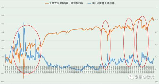 图中蓝色线为隐含波动率,橙色线为双卖策略累计绩效,2015年2月9日至2019年7月2日,无脑双卖策略的累计获利约0.56元/股,按照3元/股的50ETF价格,4年多累计获利约18.5%;再根据2张虚值2档期权约10000元(含保证金与保障资金),占10000股50ETF市值30000元的30%,前述的策略获利大约为61.5%。