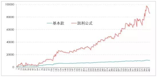 图1 基本款的盈利走势:凯利公式VS无资金管理