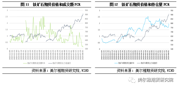 分类来看,铁矿石看涨期权和看跌期权日成交持仓量在主力合约到期前不断上升,到期后大幅下降然后再逐步增加,其中大部分时间看跌期权的成交持仓量都高于看涨期权。这与同时期的铁矿石期货价格走势有关,从PCR指标对比会更明显。PCR指标是看跌期权和看涨期权量的比值,和标的期货价格方向变化有一定相关性。铁矿石期权上市以来,前一半时间期货价格是区间震荡,然后是单边上行。成交量PCR和标的期货价格走势大致负相关(见图10),即标的价格走弱,成交量PCR值上升。当然成交量PCR波动比较大,成交额PCR负相关性就更强一些,更能体现资金的选择(见图11)。