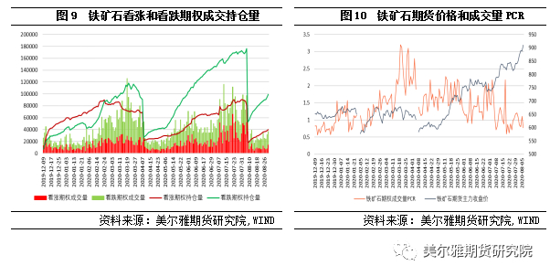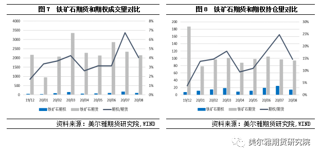 铁矿石期权自身来看,上市以来成交持仓量逐步增加,占标的期货的比例也在上升。平均而言,期权成交量占期货比例约在4%,期权持仓量占期货比例在14%左右。理论上讲,期权的成交持仓量应该比标的期货更多,一方面每个期货合约都对应不同行权价的多个看涨看跌期权;另一方面,除了和标的期货进行对冲组合,还有很大一部分只做期权投机交易。所以目前投资者使用期权还处于起步阶段,市场提升空间很大,如果期权交易非常活跃,对于标的期货的预期反应,比如类似VIX的波动率指数会更加灵敏。