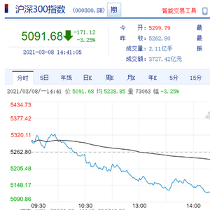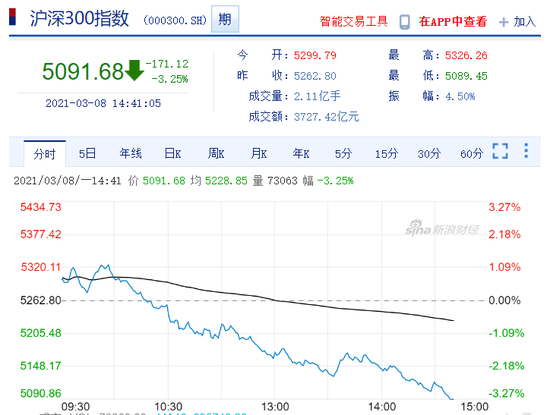 截至3月8日下午14点41分,沪深300指数盘中下跌3.25%,报5091点。