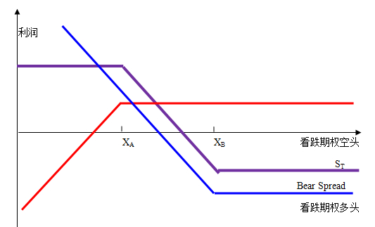 在这种价差套购中,购买的卖权预定价XA较高,出售的卖权的预定价XB 较低,即XA>XB。如下图所示:
