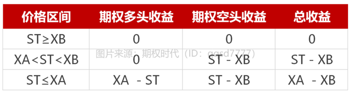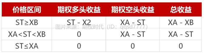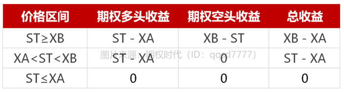 当ST≤XA时,由于标的物的市场价格小于期权的预定价格,所以期权都会被执行。这时投资者须以XB的价格购入标的物然后再以XA的价格出售掉。其获利额XA-XB为一个常数,不会随着S的变化而变化。