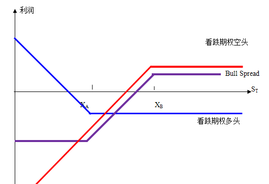 当ST≤XA时,由于标的物的市场价格小于期权的预定价格,所以两个期权都会被执行。这时投资者须以XB 的价格购入标的物后再以XA 的价格出售,该投资者的获利XB-XA为一个常数,不再随S的变化而变化。