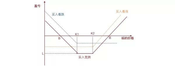 买入宽跨式策略和买入跨式策略有些类似,只不过买入跨式策略买入的平值看涨和看跌期权,而买入宽跨式策略买入的是虚值看涨和看跌期权,买入看涨期权的行权价高于买入看跌期权的行权价。