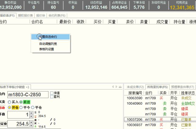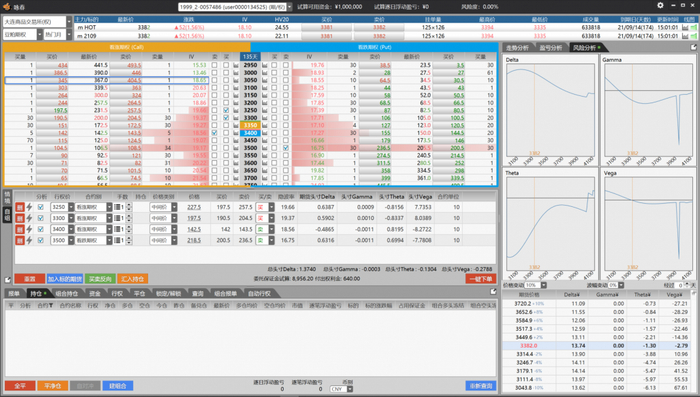 另提供用户根据市场情况自组期权下单交易并实时显示盈亏图、风险分析、希腊值参考等。下单方面,支持鼠标点击T型报价表和标的期货列呼出下单盒下单,止盈止损功能嵌套在下单盒内。