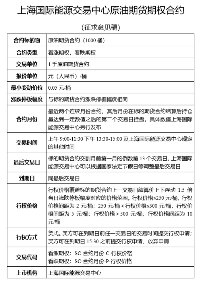 原油期货期权将沿用标的原油期货的相同路径,作为特定品种上市,采用与原油期货基本相同的交易、结算和风控等制度以及技术系统,与原油期货在同一平台运行,并向全世界投资者开放。
