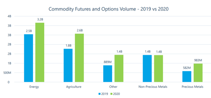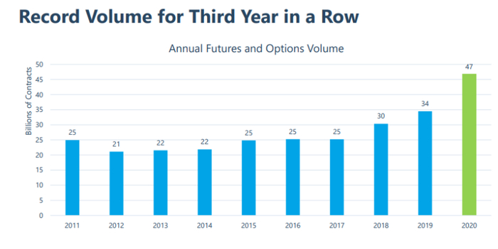 截止2020年底,期货和期权成交量达到467.7亿手,较2019年增长了25.6%。 其中,期货合约增长了32.7%达到255.5亿手,期权合约增长了39.3%达到了212.2亿手,占总成交的45.4%。期货和期权持仓量达到9.87亿张,较2019年增长了9.7%。其中,期权合约的持仓量达到7.41亿手,占总持仓的75.1%。