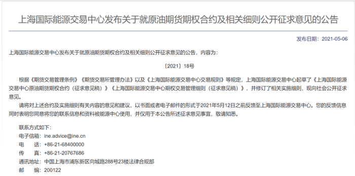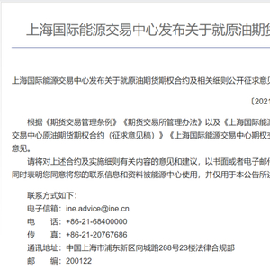 为建立健全多层次、品种齐全的衍生品市场,满足境内产业客户在国际贸易中的风险管理需求,上海国际能源交易中心计划上市原油期货期权,并于2021年5月6日发布了关于就原油期货期权合约及相关细则公开征求意见的公告,相信原油期权有望在近期上市挂牌交易,并全面引入境外交易者,原油期权上市后将成为我国第一个国际化期权品种。