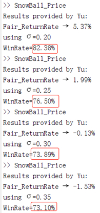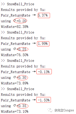 (5)雪球的收益随着波动率的增加而快速减少,如从5.37%减为-1.53%。同时,胜算率也是从82.38%将为73.1%.