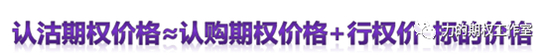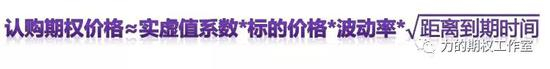 对于大部分初学期权的交易者,他们并不需要像期权做市商那样精确地知晓期权各种复杂的定价公式,而是需要通过一个直观的公式对期权的价格结构有一个清晰的认识。下面这个公式就可以视为认购期权价格的通俗表达式: