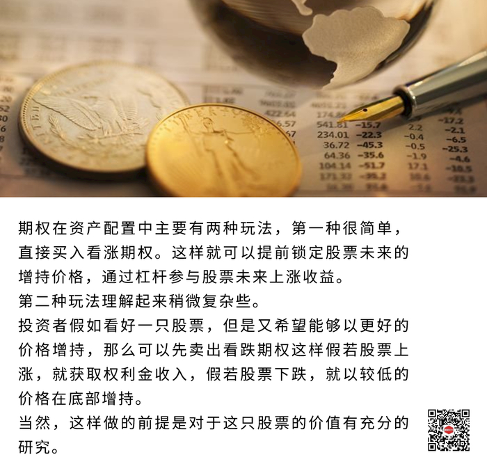 期权在资产配置中主要有两种玩法,第一种很简单,直接买入看涨期权。这样就可以提前锁定股票未来的增持价格,通过杠杆参与股票未来上涨收益。