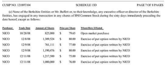 2008年的九月,巴菲特在购买柏林顿北方圣塔菲铁路公司的股票时再一次使用了卖出看跌期权。当时伯克希尔·哈撒韦的子公司卖出了约五百五十万份行权价为80美元的看跌期权。