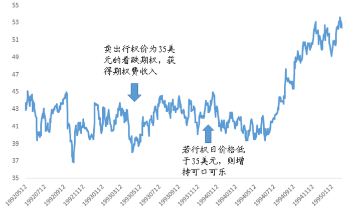 1993年4月,巴菲特以每份期权1.5美元的价格卖出了3百万份可口可乐公司股票的价外看跌期权合约,这些期权的执行日期为1993年12月,执行价为35美元,当时可口可乐公司的股票价格约为40美元。在此之后他觉得还够,又加卖了2百万份看跌期权合约。这样,通过卖出看跌期权,巴菲特一共拿到了750万美元的现金。