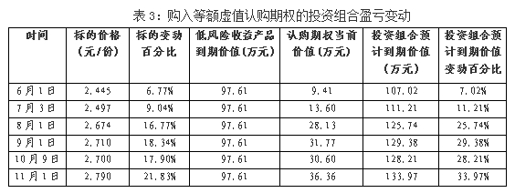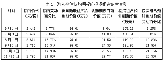 从上述三个案例结果可以看出,在资产初始配置相同的情况下,低风险产品半年期的收益为97.61万元,为整个资产组合积累了安全垫,购买期权的资金则对增强整个组合的收益起到关键作用。不同行权价格的期权合约由于杠杆倍数不同,在投入等额资金的前提下,如果市场走势与预期相符,选择虚值期权则可获得更高收益。