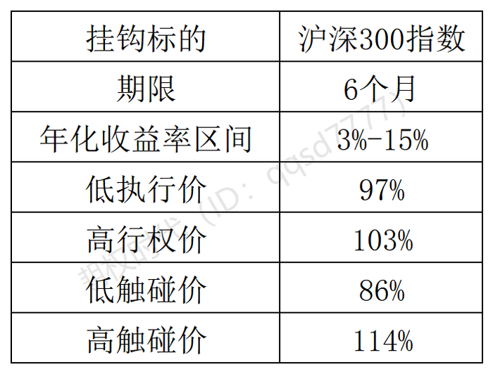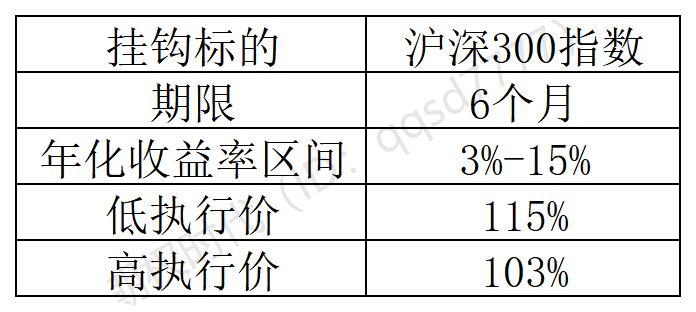 实例如下。产品描述:设定投资期限起始日收市时沪深300指数为期初价格,若沪深300指数的投资到期日收盘价高于或等于期初价格,则本计划投资期到期预期收益率为3%(年化);若沪深300指数的到期日收盘价低于期初价格,则本计划投资期到期预期收益率为9%(年化)。