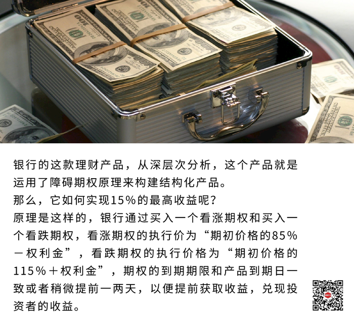 因此,上述银行理财产品就属于触碰失效期权,即标的价格超过85%-115%的障碍时,收益率就只能回归4.6%的最低水平。
