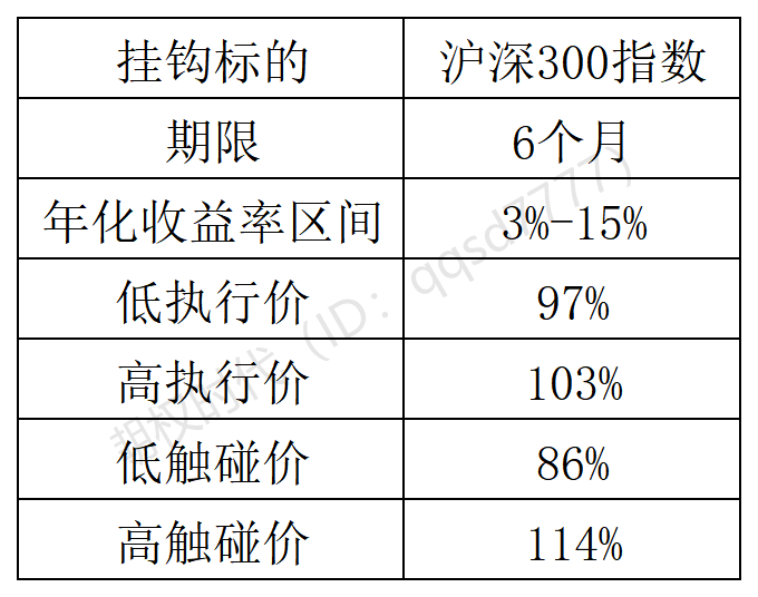 产品描述:如果6个月后,沪深300指数收盘价在期初价格的97%-107%之内,产品年化收益率为9%;如果沪深300指数收盘价涨幅超过7%或者跌幅超过3%,产品年化收益率为3%。