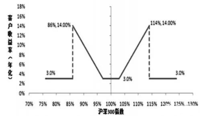 (1)产品运行期内,如果任一日沪深300指数收盘价相比期初价格涨幅超过14%或跌幅超过14%,产品到期年化收益率为3%;(2)产品运行期内,如果每日沪深300指数收盘价相比期初价格从未触及到高触碰价114%和低触碰价86%,产品到期年化收益率R=3%+max(Ir%I-3%,0)。