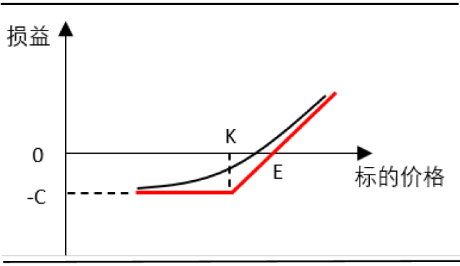 此外,我们画了两条曲线(红色和黑色),其中红色的线代表的是行权的盈亏曲线,其中E是盈亏平衡点,只要到期时标的价格≥行权价格+支付的权利金+其他费用 ,那么持有者行权是有利的。