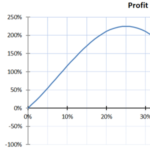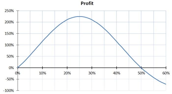 图的横轴表示参与者每次投入资产的百分比,纵轴表示 20 次之后的总收益。