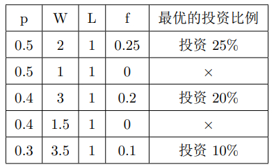 如果用 1 元投资,假设平均获得收益的金额为 W,平均可能亏损的金额是 L,那么最优投资比例 f 可以用凯利公式算出。