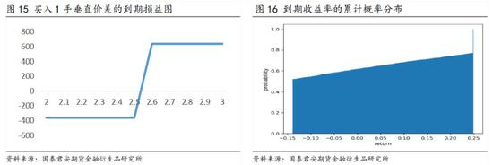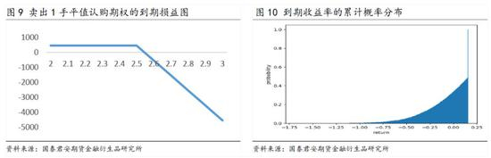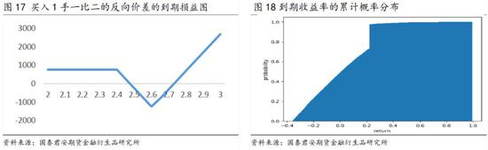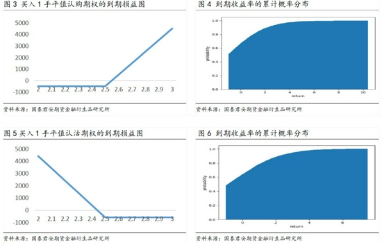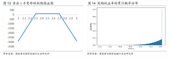 有了标的价格轨迹与分布,我们代入不同期权策略,具体的计算中,我们假设做1手策略,合约乘数是10000,每一个策略由两张图展示其收益特征,左边是盈亏图,代表1手策略在期末时,标的不同价格下的损益情况,右边是收益率的累积概率分布图,计算收益率时,分子是单笔损益,分母方面,期权买方是全部权利金,期权卖方是要求的初始保证金减去收到的权利金。