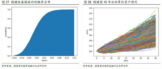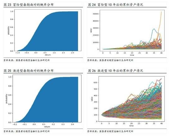 图23-28展示了三类人群每期投资的概率分布,以及经过10年后的累积资产情况。