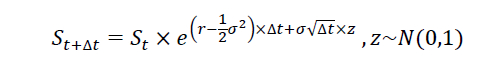 其中,St是t时刻资产价格,r是常数漂移项,代表市场平均预期收益率,σ是标准差,代表了概率分布的离散程度,z是随机项服从标准正态分布。