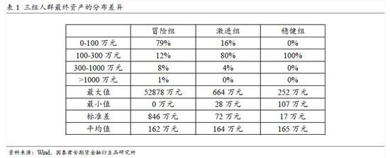 经过10年,40个周期后,表1 展示了三组人群最终资产的分布。如果我们把最终的资产水平分位4档,最低档低于100万元,然后是100-300万元和300-1000万元两档,最高档高于1000万元,那么稳健组全部在100-300万元档,激进组部分进入最低档和第二高档,而冒险组有大量进入最低档,同时有1%的冒险组进入最高档,并且最高档全部来自冒险组。冒险组的标准差极大,最低值为0元,最高值达到了5.2亿元,而稳健组标准差很小。