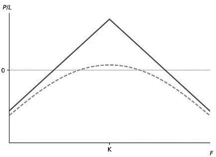 因此,随时间的流逝持有卖出跨式会不断收到Call与Put时间价值的衰减部分。到期当日,若标的物恰巧收于建仓的行权价,Call与Put价格全部转化为时间价值,并衰减归零,这就是损益图中最大获利的由来。只要标的价格稍有偏离,Call与Put一方价格就不会归零,并随偏离程度的增大而上升,最后导致策略亏损。