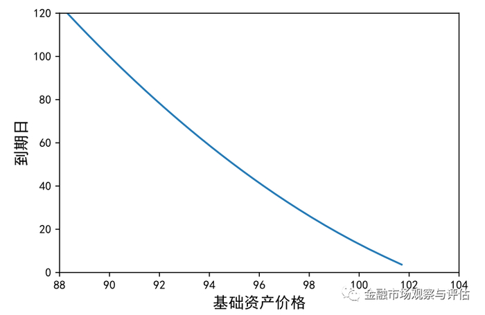 例四:当前股票价格为90 元,某看涨期权合约的行权价格为 100 元,存续期为100 天,价格为2.22元(隐含波动率为 28.53%)。根据数值模拟的结果,存续期的流逝与所需股票价格水平之间的关系就如下图所示,近似一条向下倾斜的直线。作为验证,在到期日(存续期为零时),为保持期权价值不变,股票价格须达到 102.22 元。
