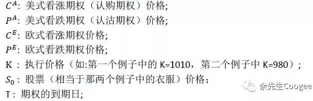 标的资产(衣服)的价格为S=1000元,第一个例子中的执行价格K=1010元,第二个例子中K=980。